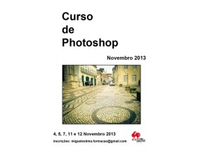 | | |  | | Curso de Photoshop - Novembro 2013 | | | | | inscrições: miguelestima.formacao@gmail.com... | | | ver mais | |
